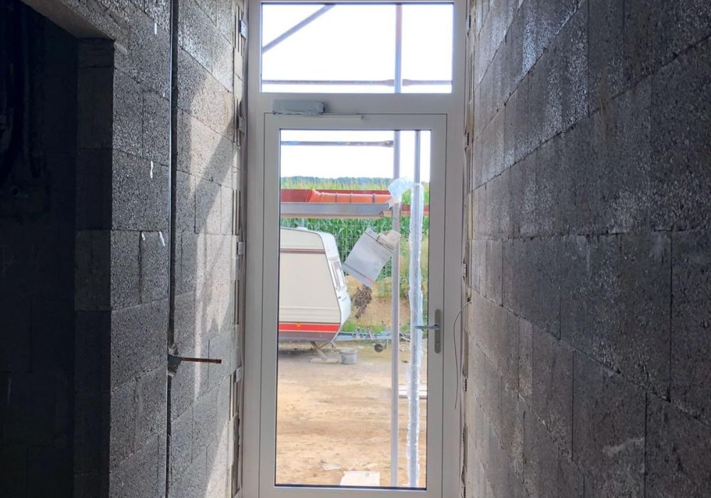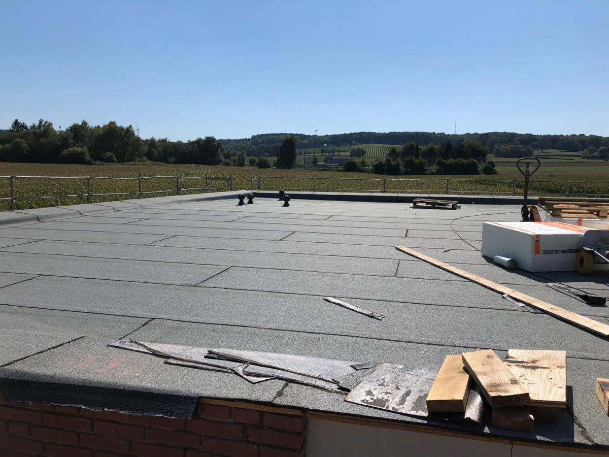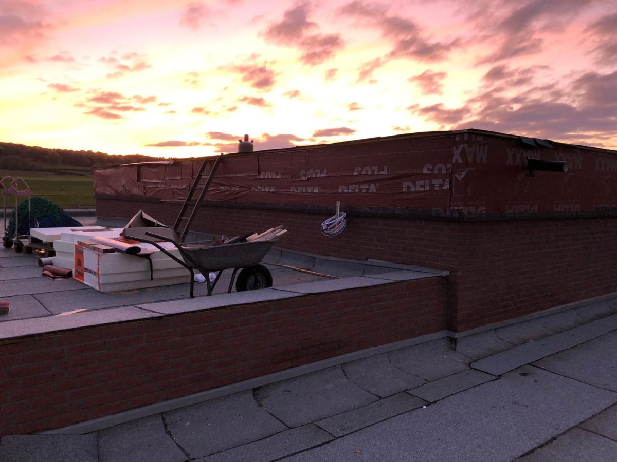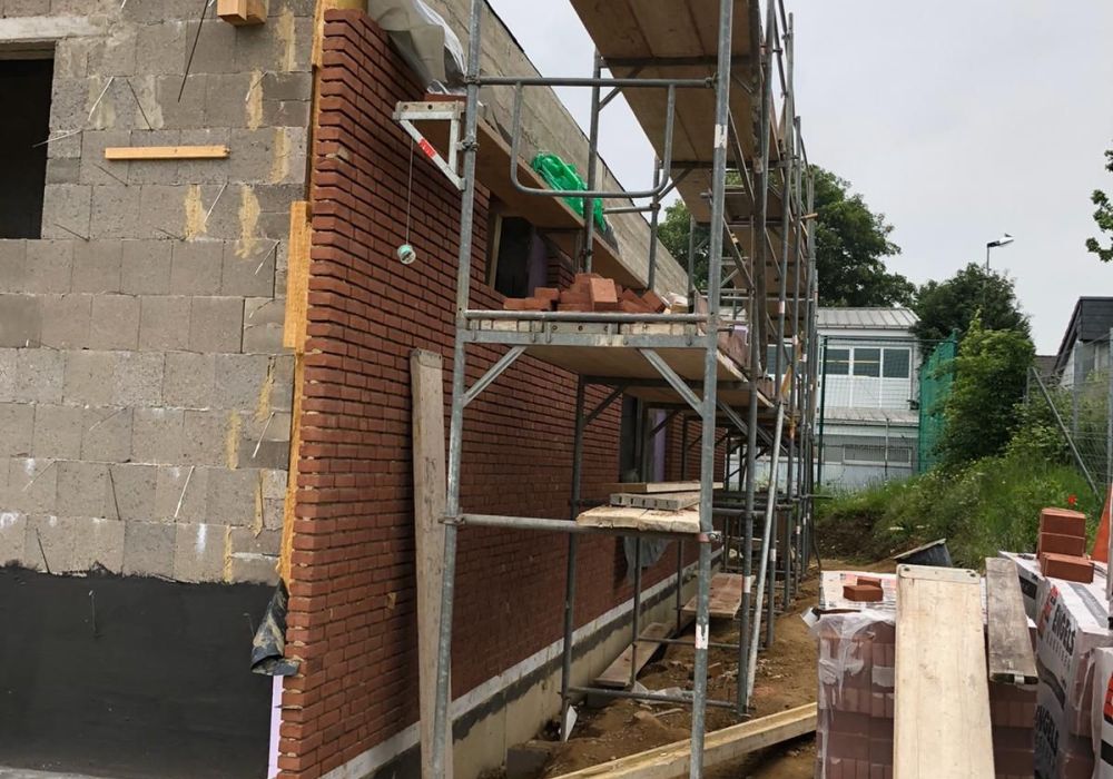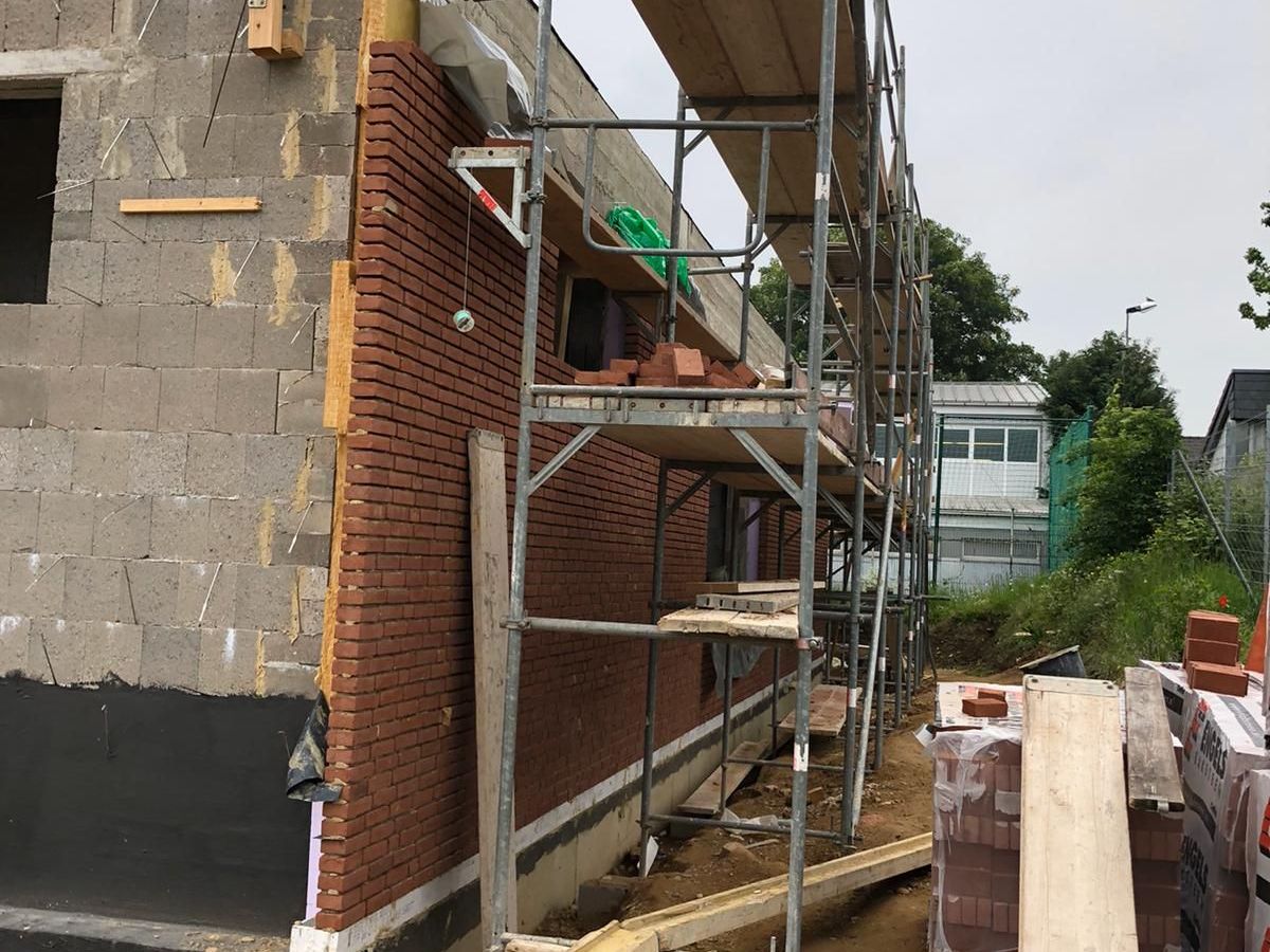 Nachdem der Rohbau steht, geht es außen und oben weiter. Die Maurer versehen den Anbau mit einer Klinkerfassade und die Dachdecker sorgen dafür, dass von oben kein Wasser mehr ins Gebäude gelangt.