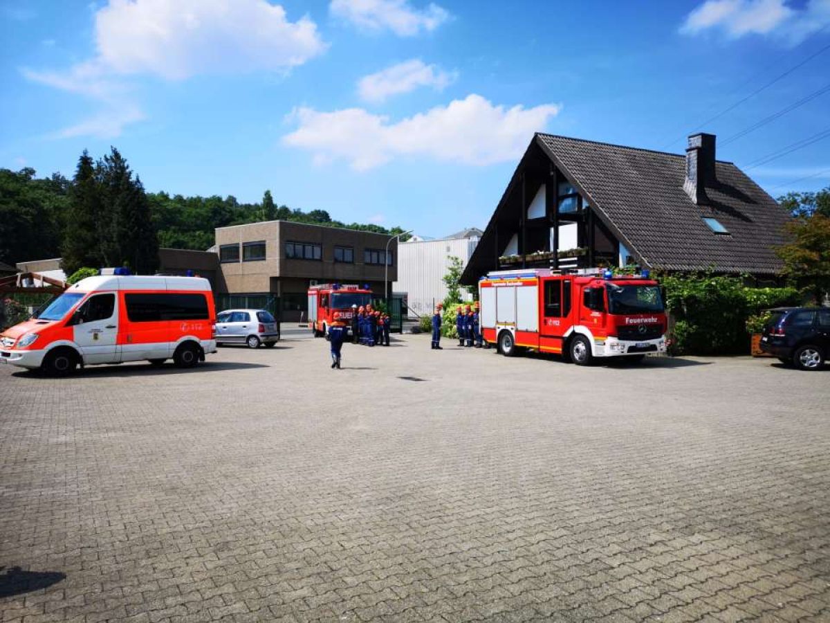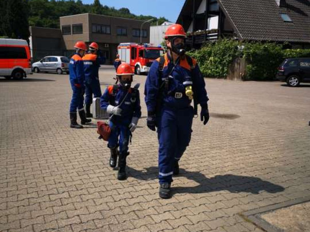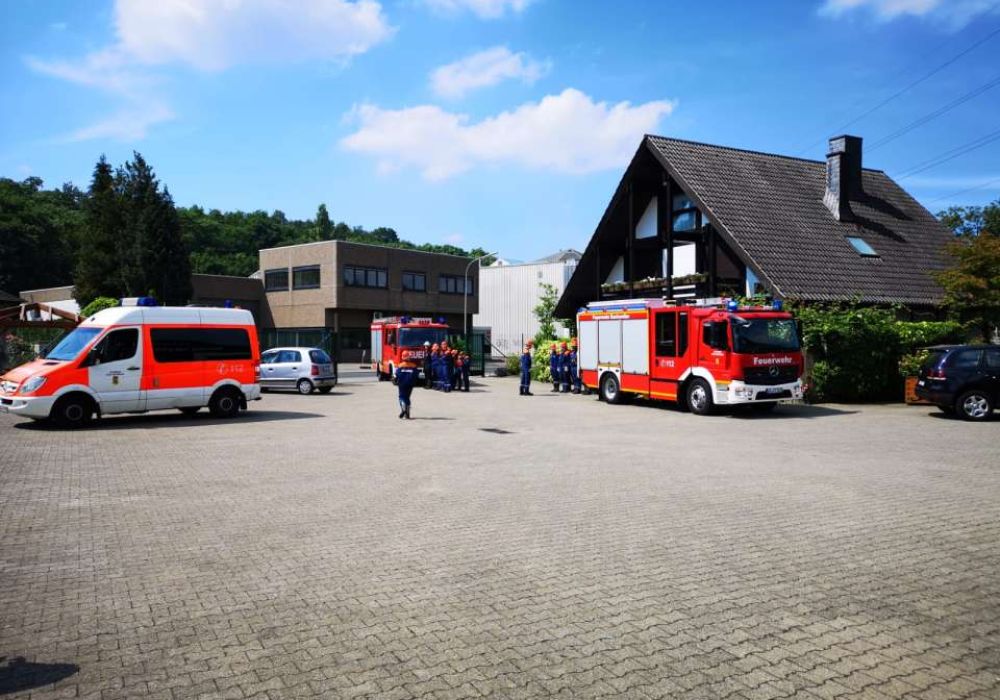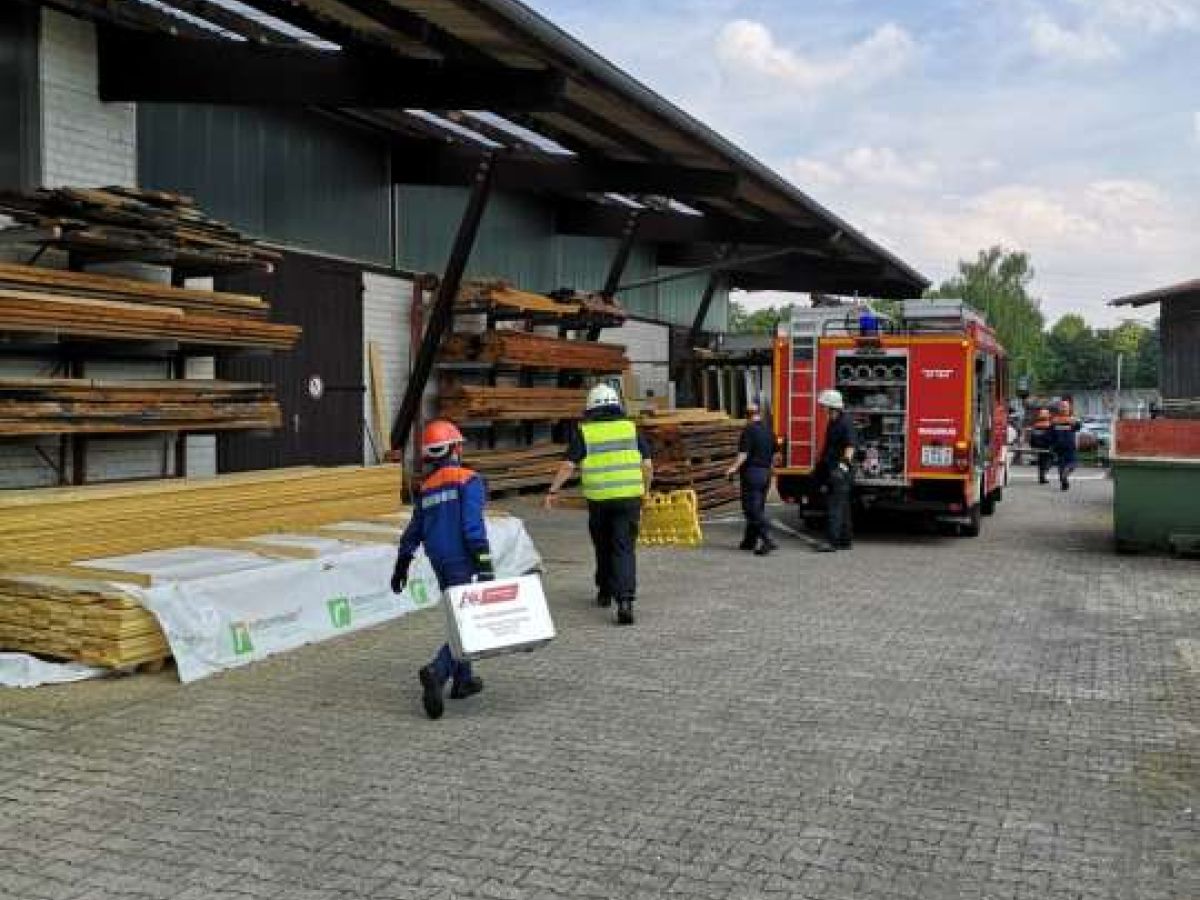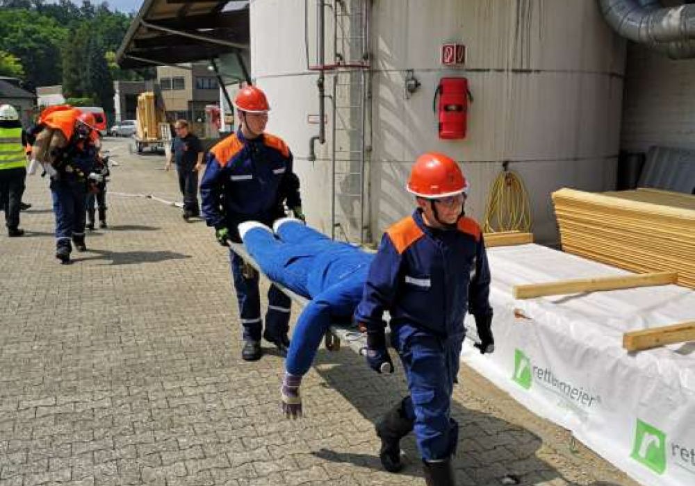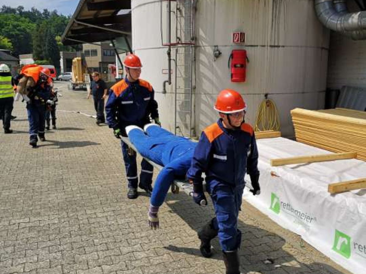 Ab und zu unterstützt unser Löschzug auch die Jugendfeuerwehr. Am 22.06.2019 hieß die Einsatzlage „Feuer Gewerbe“ bei der Firma Holzbau Engels in Eschweiler. Es brannte im Silo und in einem angrenzenden Schuppen. 5 Personen wurden vermisst und mussten durch die Nachwuchsfeuerwehrleute gerettet werden. Die Übung war ein voller Erfolg.